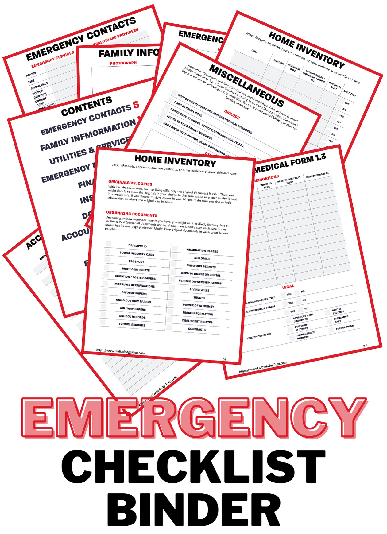 An emergency checklist binder is one of the most important yet overlooked aspects of preparedness.After being approached by many people who were confused about what info to include and how to organize it, we decided to compile a binder of forms and worksheets that anyone can easily fill out.Simply type your info into the PDF, save a digital copy, and print out a copy.If you prefer, you can print the binder and fill it out by hand.It couldn’t be easier. There’s no confusion or headaches. Just clarity and peace of mind.